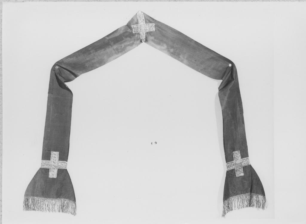 - NOTIZIE STORICO CRITICHE Gli stemmi collocati sulla pianeta e sul velo omerale ricordano che il parato in esame venne realizzato in onore di Sant'Andrea, martire al quale è intitolata la Cattedrale venosina. Una corretta datazione ed attribuzione è resa difficile dall'assenza di decori. L'analisi tecnica suggerisce una collocazione orientativamente nella produzione tessile della seconda metà del sec. XIX; la manifattura potrebbe essere dislocata in ambito meridionale