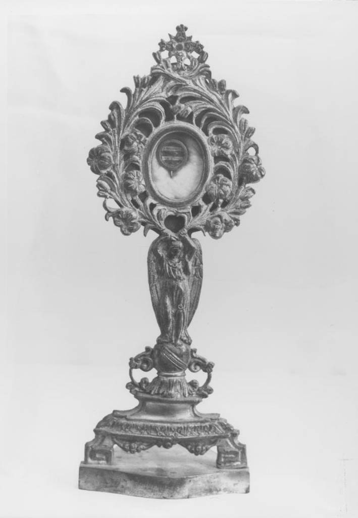 Supporto ligneo. Base: a sezione mistilinea poggiante su due piedini. Fusto: figurato con angelo. Teca: a òuce ovale, chiusa tra due rami con fiori umbonati