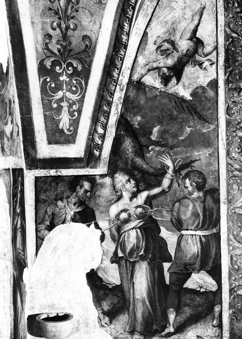 - NOTIZIE STORICO CRITICHE Il riquadro è stato danneggiato in basso e a sinistra per l'inserto di un'acquasantiera e per la caduta di una parte del colore. E' probabile che in quella zona si trovasse la scritta col nome delle suore committenti. Qui il Ferro raggiunge una certa intensità espressiva e sembra al corrente di opere del napoletano Francesco Curia, come farebbe pensare la figura di quell'angelo tuffato in volo. A meno che, ed è più probabile, non si tratti solo di un'affinità culturale e che l'angioletto non sia derivato da qualche modello degli Zuccari. Esso, infatti, manca nella fonte ispiratrice della scena, cioè nella stampa con il Martirio di S. Agata che Cornelis Cort trasse da un'opera di Giulio Clovio nel 1567 (Barbone Pugliese N. 1996, p. 180, fig. 20)