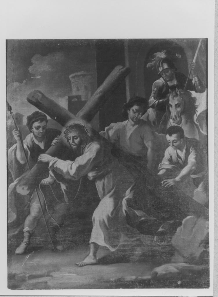 Personaggi: Cristo. Attributi: (Cristo) corona di spine. Figure: soldato; sgherri. Oggetti: croce; fune; lancia; vessillo. Architetture: fortezza. Paesaggi. Elementi architettonici: porta di Gerusalemme. Animali: cavallo