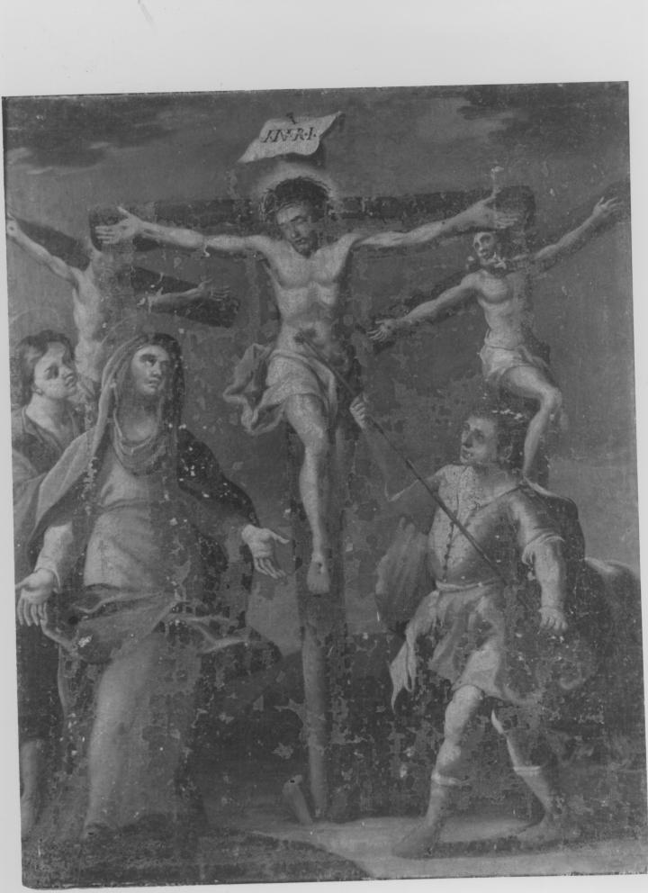 Personaggi: Cristo; Madonna; San Giovanni evangelista. Attributi: (Cristo) corona di spine. Figure: sgherro; i due ladroni. Oggetti: tre croci; lancia. Paesaggi: Calvario