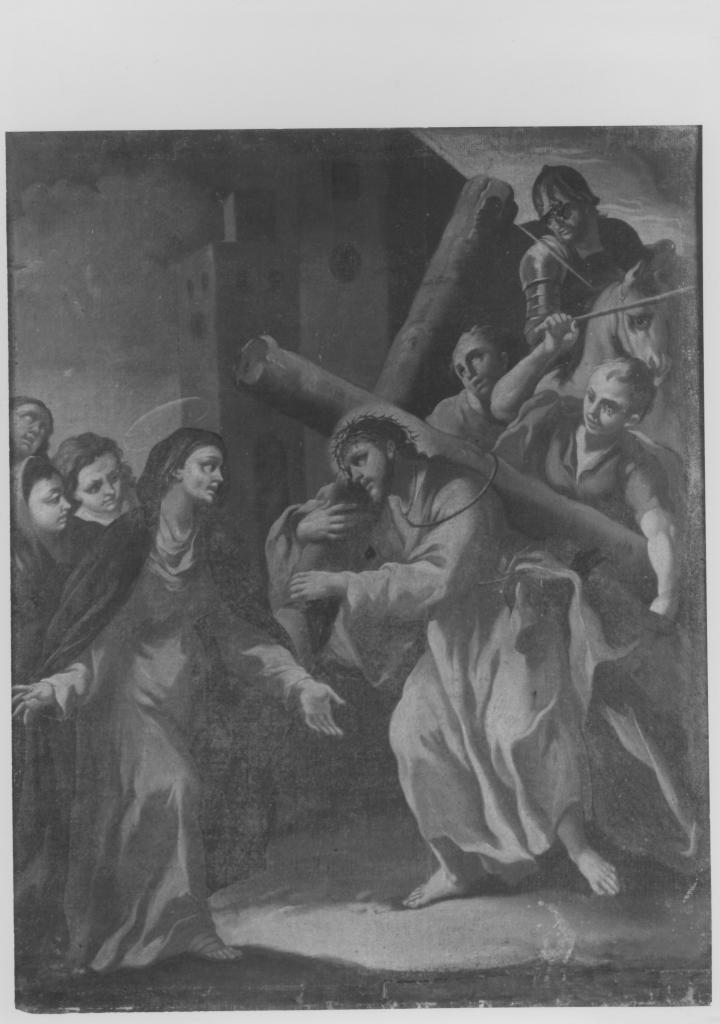 Personaggi: Cristo; Madonna. Attributi: (Cristo) corona di spine. Figure: donne; soldato; sgherri. Oggetti: croce; fune; lancia; bastone. Architetture: edificio. Animali: cavallo