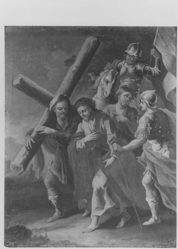 Personaggi: Cristo; il Cireneo. Attributi: (Cristo) corona di spine. Figure: soldati; giovane uomo. Oggetti: croce; fune; bastone; vessillo. Animali: cavallo. Paesaggi