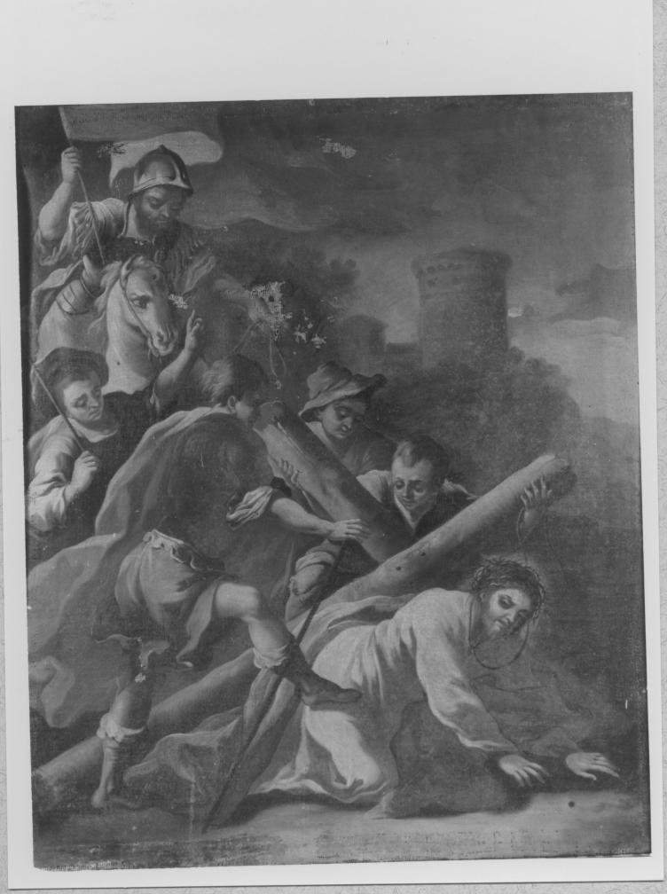 Personaggi: Cristo. Attributi: (Cristo) corona di spine. Figure: soldato; sgherro; giovane donna e giovani uomini. Oggetti: croce; bastone; vessillo. Animali: cavallo. Paesaggi. Architetture: torre