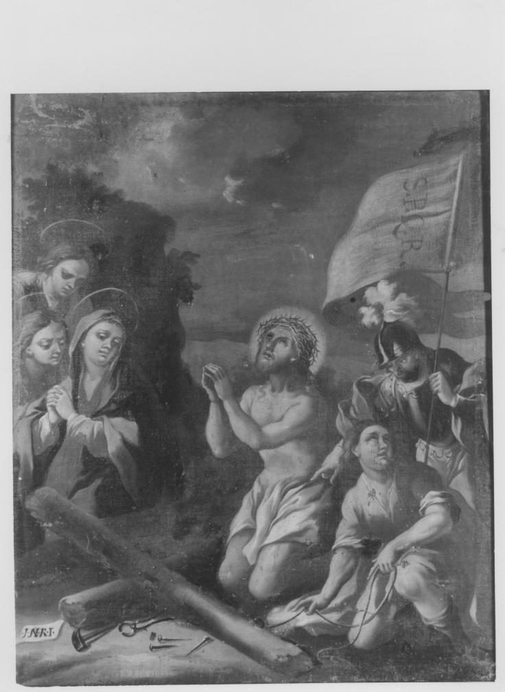 Personaggi: Cristo; le tre Marie. Attributi: (Cristo) corona di spine. Figure: soldato; sgherro. Oggetti: croce; chiodi; martello; cartiglio; fune; vessillo. Paesaggi