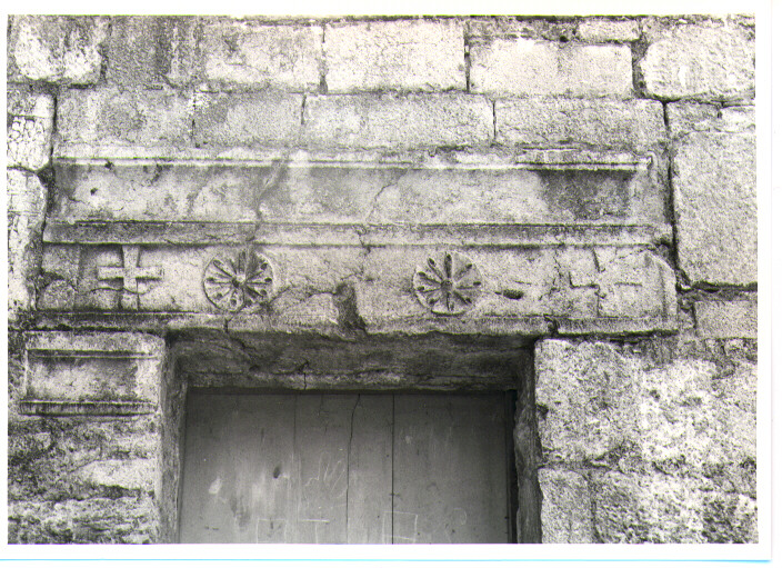 L'architrave è diviso in due fasce, quella superiore liscia e lievemente convessa, quella inferiore ornata da due croci e dadue rosette stilizzate