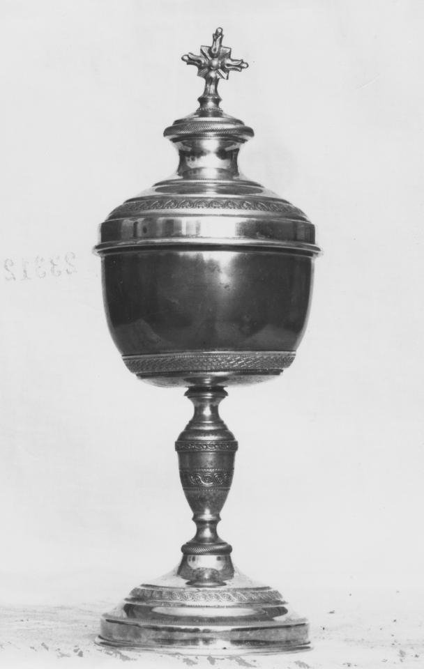 la metallica base circolare con orlino periferico, leggermente bombata,ha cornici concentriche listellate e scalate con greca a nastrointrecciato e rosetta interna, presente anche sul nodo centrale a olivadel fusto a cordonatura terminale. il metallico sottocoppa ridotto èfregiato di una dorata cornice a motivi losangati con coppa internad'argento. Il coperchio ad incastro con orlo periferico è decorato alpari della base con la variante della palmetta d'acanto in ogive. lacroce terminale è gigliata