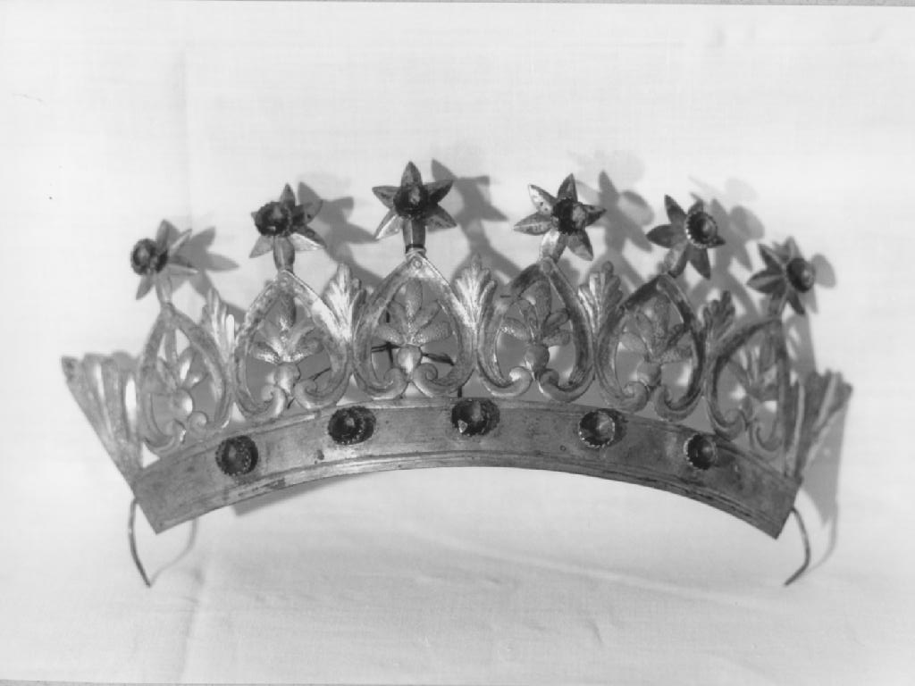 Cerchio: con orlo modanato e gemme di vetro colorato con montatura a csto ne. Fastigio: a palmette entro elementi cuoriformi, sormontati da stelle a sei punte con gemme di vetro colorato entro montature a castone