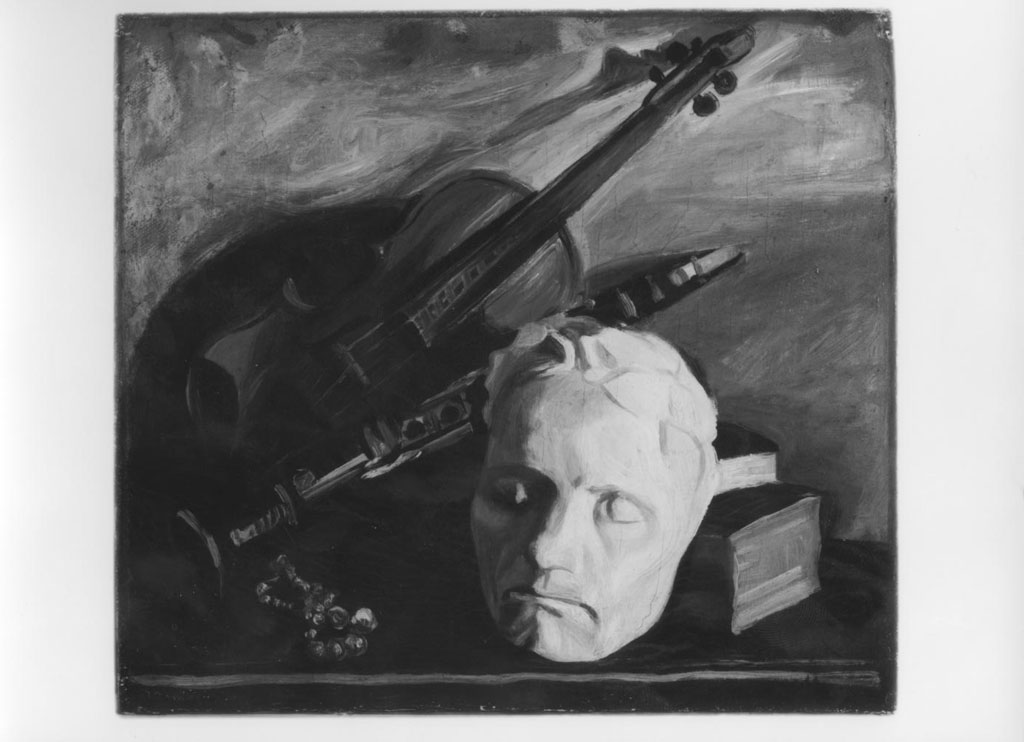 Natura morta con strumenti musicali e maschera di Beethoven. natura morta con strumenti musicali
