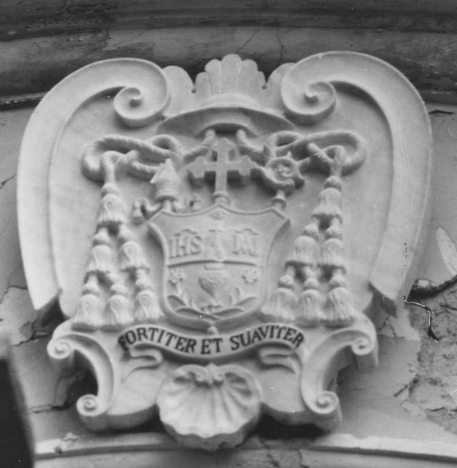 Al centro lo stemma troncato: nella parte superiore il monogrammacristologico e quelli mariani a fianco di tre monti sormontati dallacroce, a sua volta sovrastata dall'occhio della Trinità. Nella parteinferiore, il cuore avvolto dalla corona di spine e sul quale ardono lefiamme; in basso tre frecce, orientate verso il cuore, partono dalla basedi due fiori intrecciati. Lo stemma ha sulla sommità il cappellocardinalizio a sinistra, la croce vescovile al centro, il bastonepastorale a destra. E' sormontato dal cappello vescovile ed inserito inuna cornice mistilinea a volute, terminante in basso con una conchiglia