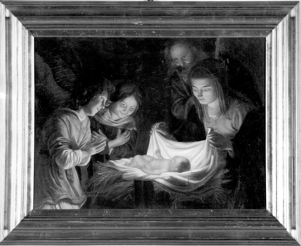 Il dipinto raffigura la nascita di Gesù, adorato da Maria, Giuseppe e alcu ni bambini, probabilmente giovani pastori. La scena appare molto intima pe r la vicinanza dei personaggi al Signore, che dorme tranquillo entro la mi sera culla. La luminosità irradiata dal piccolo Gesù illumina anche i volt i degli altri personaggi adoranti. Cornice dorata