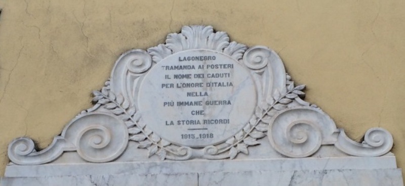 - ISCRIZIONI parte superiore - LAGONEGRO/ TRAMANDA AI POSTERI/ IL NOME DEI CADUTI/ PER L'ONORE D'ITALIA/ NELLA/ PIU' IMMANE GUERRA/ CHE LA STORIA RICORDI/ 1915-1918 - maiuscolo -