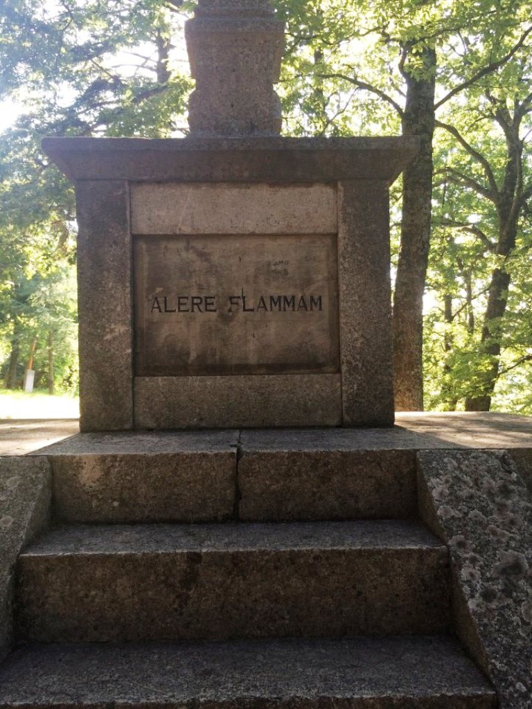 Su una breve gradinata in pietra si innalza un altarino costituito da un basamento in pietra di forma rettangolare delimitato da una cornice modanata orizzontale e che presenta iscrizioni sulla facciata principale e posteriore. Al di sopra è una colonna costituita da un elemento inferiore in pietra ornato su entrambe le facciate laterali da un bassorilievo raffigurante un elmo militare. La colonna, caratterizzata da una base stondata e da un plinto squadrato, termina con un abaco oltre il quale si trova una lanterna votiva in bronzo