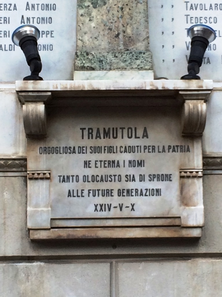 La lastra marmorea di forma rettangolare, affissa alla parete del Palazzo comunale del paese, presenta nella parte terminale superiore, al di sopra di una cornice in marmo modanata, un elemento in marmo dalla forma geometrica che funge da sfondo ad una piccola scultura bronzea raffigurante un’aquila dalle ali spiegate che si erge su un pilastro di granito verde attraversante la lapide per tutta la sua lunghezza. Al di sotto della scultura è un bassorilievo in bronzo raffigurante lo stemma della città di Tramutola circondato da un tondo ornamentale dalle cui estremità partono due festoni, uno a destra e l’altro a sinistra, che presentano tondi terminali con motivi floreali. L’elenco dei caduti della Prima guerra mondiale è diviso sulle due lastre laterali in cui il pilastro separa la lapide, caratterizzata nella parte terminale inferiore da una mensola con due volute incornicianti una iscrizione dedicatoria