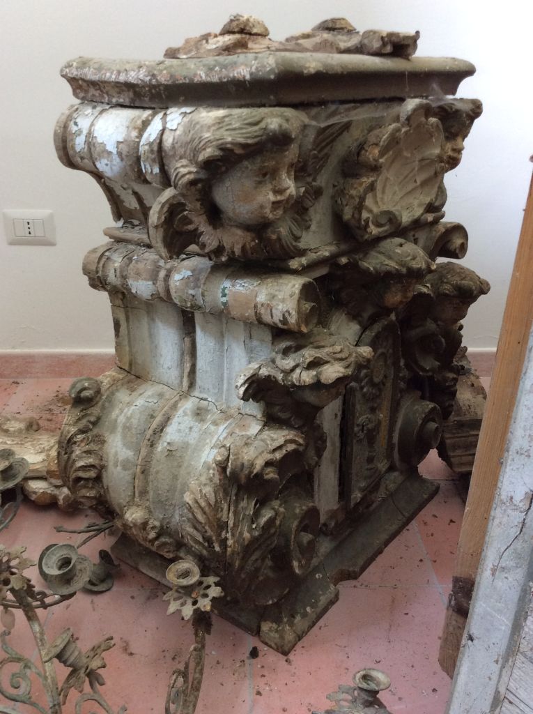 - NOTIZIE STORICO CRITICHE Il manufatto, di buona fattura, è verosimilmente di produzione di abili scalpellini di ambito meridionale. Si trovava originariamente sull’altare maggiore della Cappella di Santa Filomena. La cappella, di proprietà privata, risale agli inizi del XVIII secolo. Faceva parte di un complesso ed era annessa ad una palazzina. Ad una committenza privata sembra riconducibile anche il manufatto. Ad oggi il bene è conservato in cattivo stato di conservazione presso i depositi del Comune