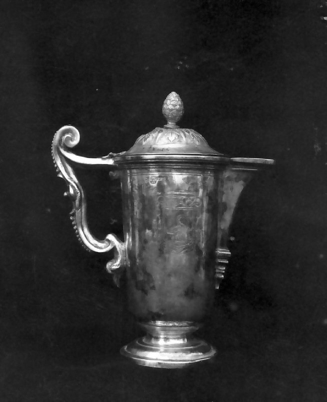 Base circolare sagomata e corpo leggermente svasato con versatoio, entrambi privi di decorazioni, eccetto uno stemma vescovile inciso in alto al centro della pancia; coperchio rigonfio ornato da una teoria di foglie stilizzate con pomo a forma di pigna; manico a forma di voluta fogliacea terminante in alto con ricciolo