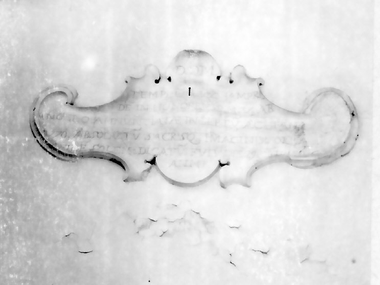 Cartiglio in stucco bianco e a volute, recante un'iscrizione