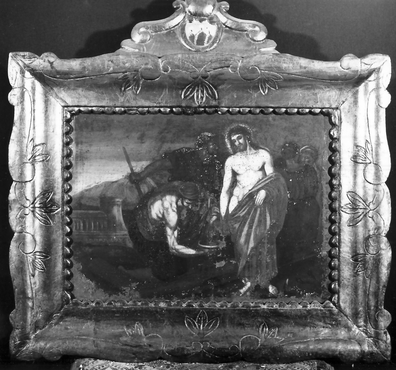 Gesù in piedi, contornato da giudei. Sulla sinistra uno di essi, piegato, regge una coppa. Le scrostature non permettono di capire bene l'azione che si sta svolgendo. Il dipinto appare rovinato in diverse parti