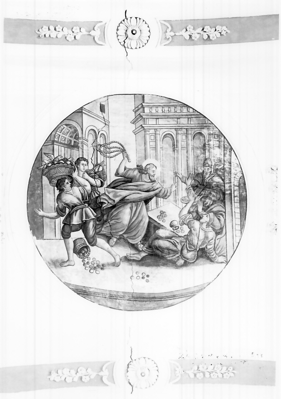 Dipinto raffigurante sullo sfondo di ampie composizioni architettoniche la seguente scena: Cristo scaccia i mercanti dal tempio