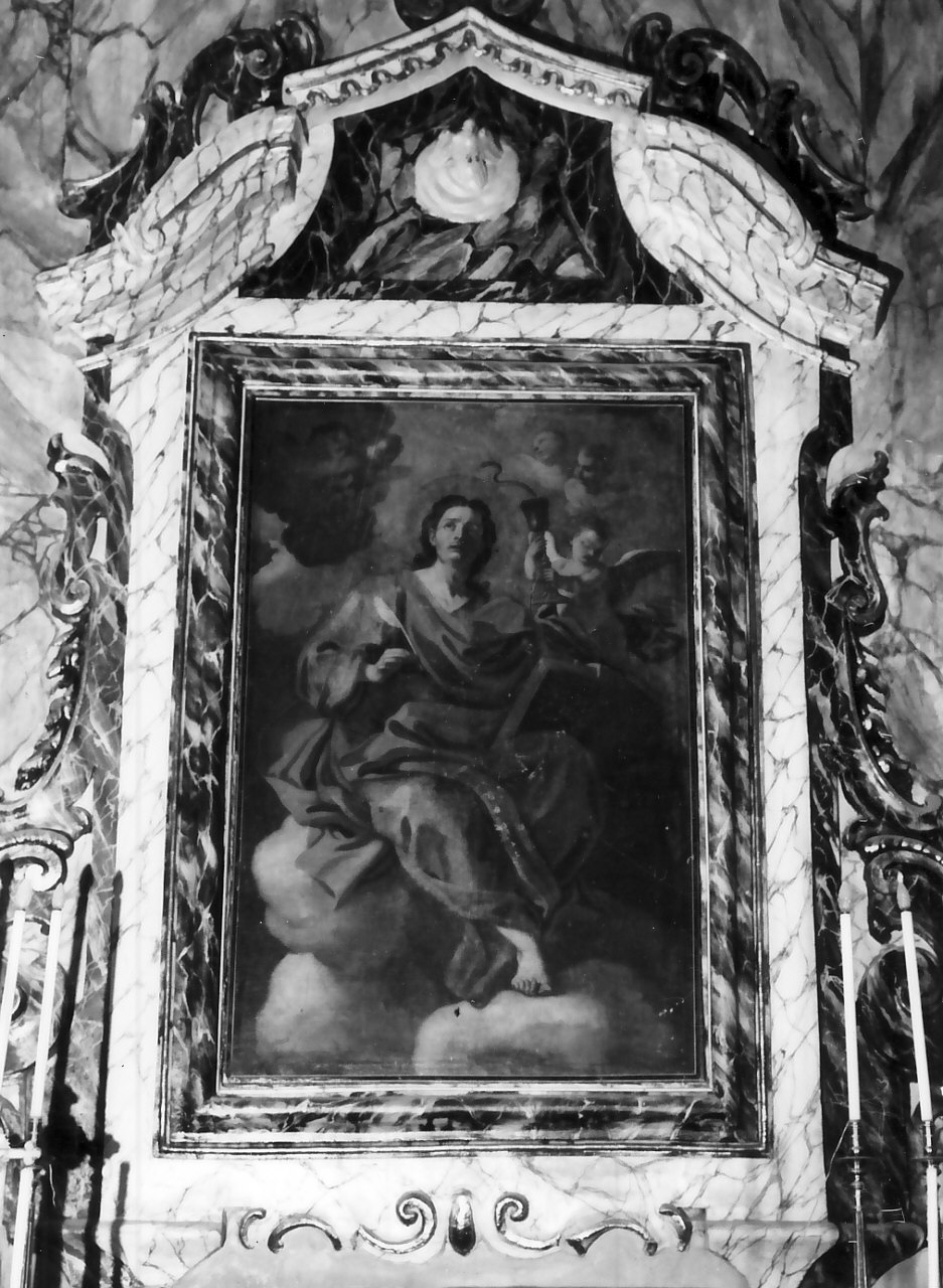 DIpinto su tela raffigurante S. Giovanni Evangelista in atto di scrivere su libro aperto, seduto su trono di nubi, avvolto da ampie vesti e contornato da testine alate e da puttino sorreggente il calice col serpente