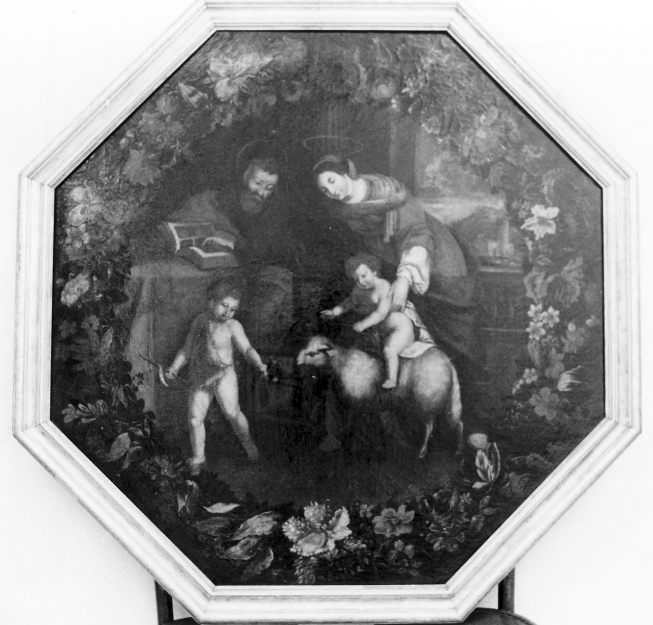 Telaio ottagonale. In primo piano i due bambini; S. Giovannino a sinistra, coperto da una pelle d'animale, ha nella mano destra la croce avvolta dal cartiglio, Gesù a destra, coperto da un drappo, è aiutato dalla Madonna a stare sul dorso dell'agnello. Giuseppe, dietro un tavolo, sfoglia la pagina di un libro e guarda il Bambino. Alle spalle di Maria una finestra è aperta sul paesaggio in cui si vede una chiesa ai piedi di un monte. La scena è incorniciata da una ghirlanda di fiori e foglie