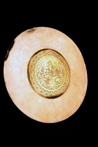 Circolare con parte centrale incavata, presenta una decorazione a cerchi concentrici lavorati ad effetto di confronto. la parte centrale è segnata da un giro di finte baccellature incise a bulino. la medesima tecnica è stata usata per realizzare la raffigurazione centrale che ha come soggetto l'Ultima cena, con la figura del Cristo posta sul fondo e gli apostoli schierati sei da un lato e sei dall'altro lato della mensa; due di essi volgono il dorso allriguardante, un terzo dorme col capo chino sulla tavola