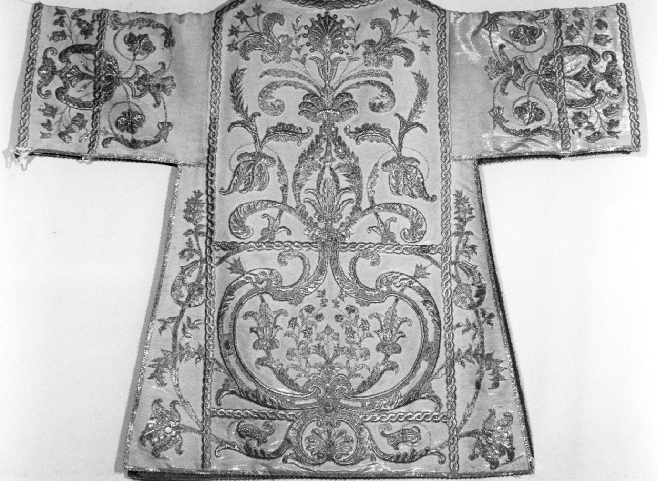 - NOTIZIE STORICO CRITICHE La tonacella fa parte di un parato composto della tonacella stessa, dalla pianeta, dalla tonacella, un piviale, due stole, tre manipoli, una fascia, un velo omerale, un velo da calice e una busta per corporale. Nel restauro, le parti posteriori delle tonacelle, utilizzandole per costituire la presente tonacella, per cui esse risultano composte l'una delle due parti anteriori e l'altra da due parti posteriori