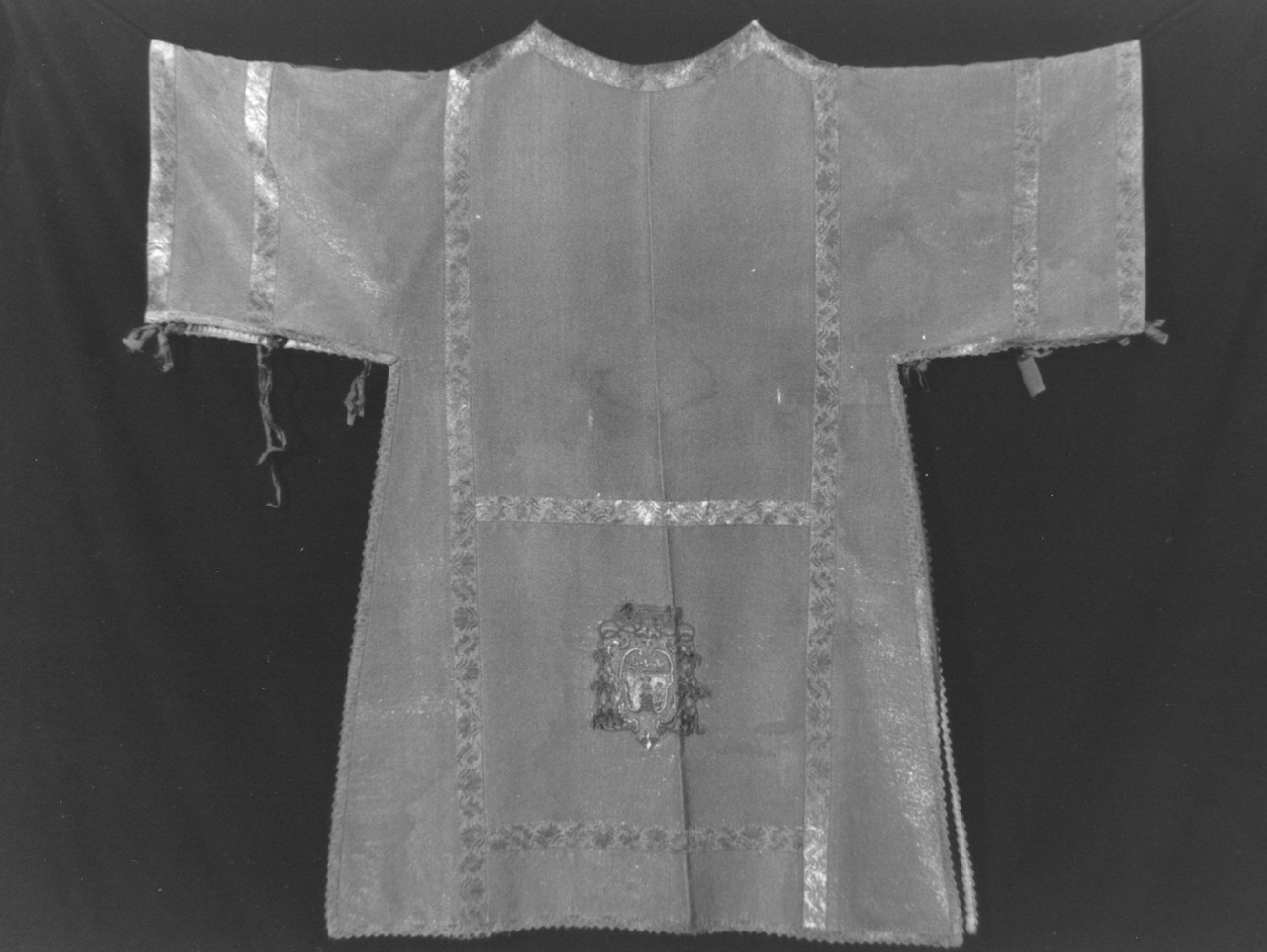 Di seta gialla a trama di filo d'oro la tonacella ha stemma sul retro in basso; torre a tre ordini, capretto (leone) rampante; tre gigli fiorentini in fascia e altro giglio uguale ma più grande in alto. Girali in filo d'oro a punto pieno. fattura buona ma non raffinata. Macchie di umidità al centro e in basso