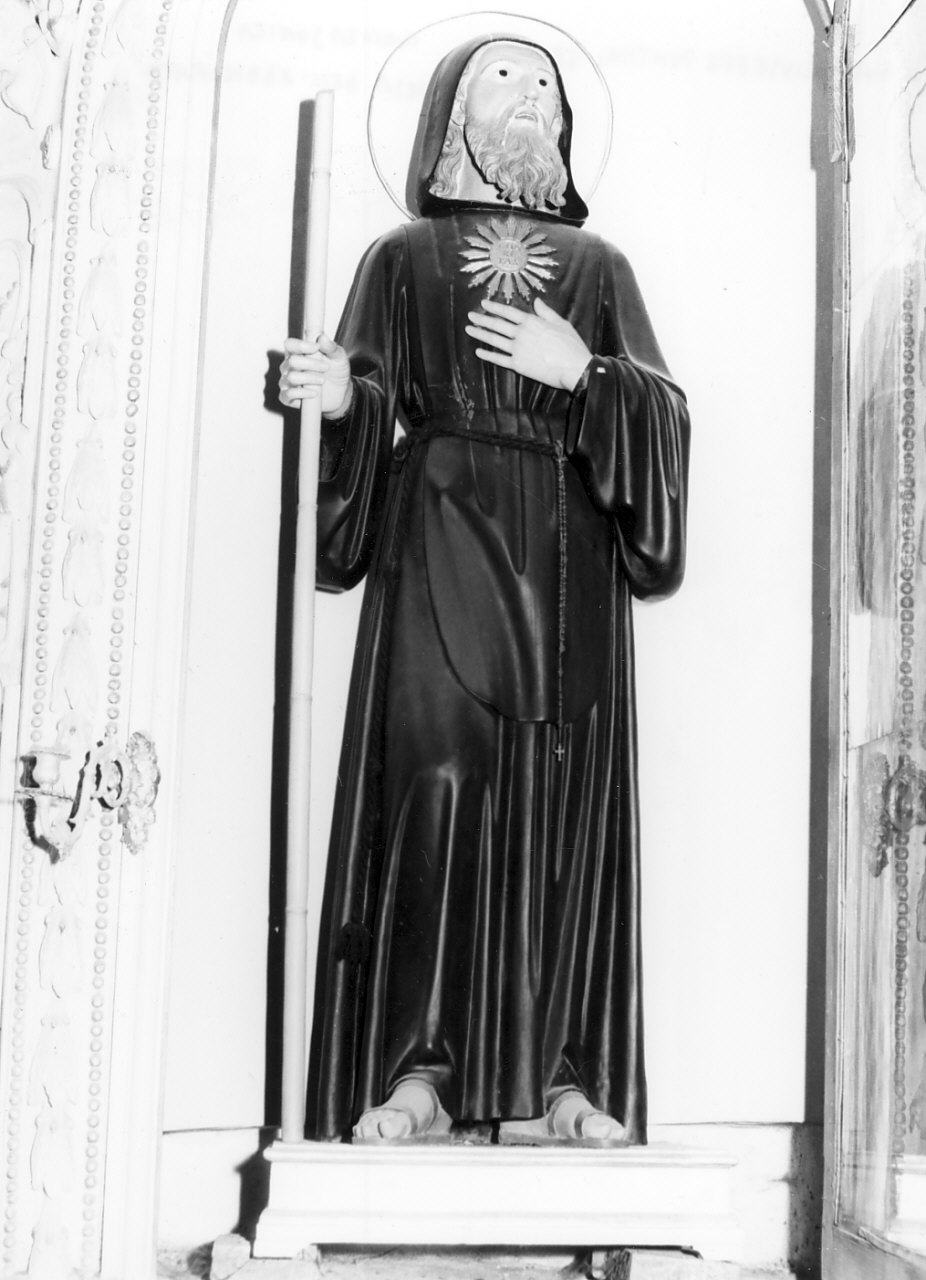 Statua raffigurante San Francesco di Paola secondo l'iconografia tradizionale: bastone da pellegrino nella mano destra; mano sinistra portata la petto, ornato da consueto motivo raggiato