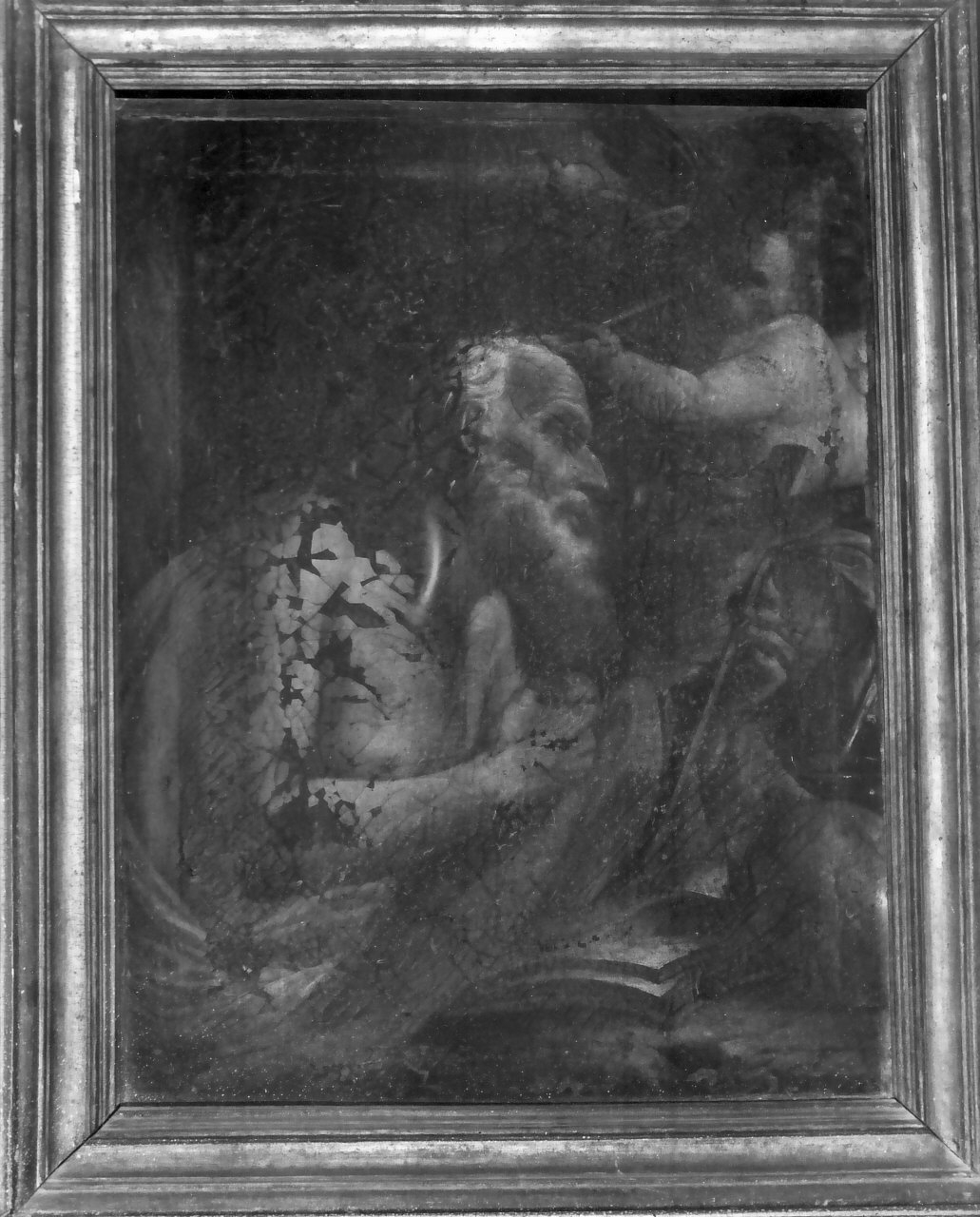 - NOTIZIE STORICO CRITICHE Opera di buona qualità da comprendere nell'attività di un ignoto maestro meridionale tardobarocco, di scuola e formazione palesemente prossime all'insegnamento del Preti. La tipologia del volto del Santo, puntualizzata nella fronte corrugata, nelle orbite immerse nell'ombra, nel naso aguzzo, si rifà con evidenza a esempi ben noti del maestro calabrese, basti osservare certe figure virili di età matura per coglierne le dirette assonanze: il S. Giuseppe della "Presentazione al Tempio" (Taverna, Chiesa di S. Barbara) oppure il "Dio Padre benedicente" della chiesa partenopea di S. Agostino degli Scalzi. Se mai ciò che distacca questa tela dalla pittura del Preti è la qualità della luce, che in questo caso non raggiunge mai la purezza e il nitore dei contrasti del maestro, ma affida a una ben dosata anche se convenzionale modulazione tonale, interrotta da qualche nota chiarissima, se non candida, si noti la chioma e la lama di luce riflessa sul collo del santo, il clima di estraniata solitudine che domina il dipinto