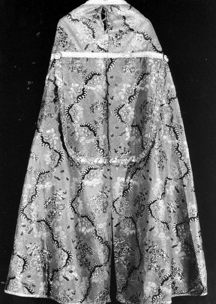 Piviale con il fondo in seta rosa antico broccato a fiorami policromi e a filo d'argento, e con galloni a filo d'argento
