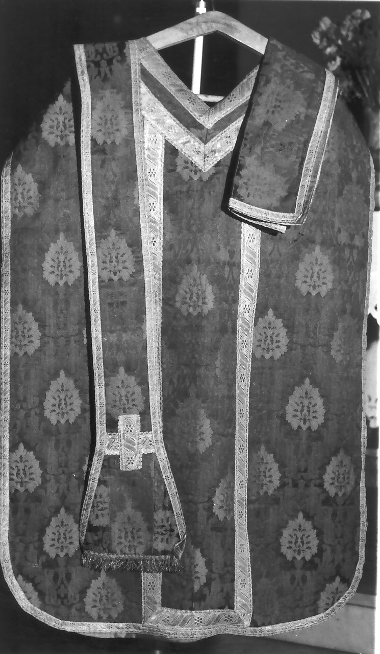 Pianeta corredata da stola e velo di calice in seta rossa damascata e gallone dorato
