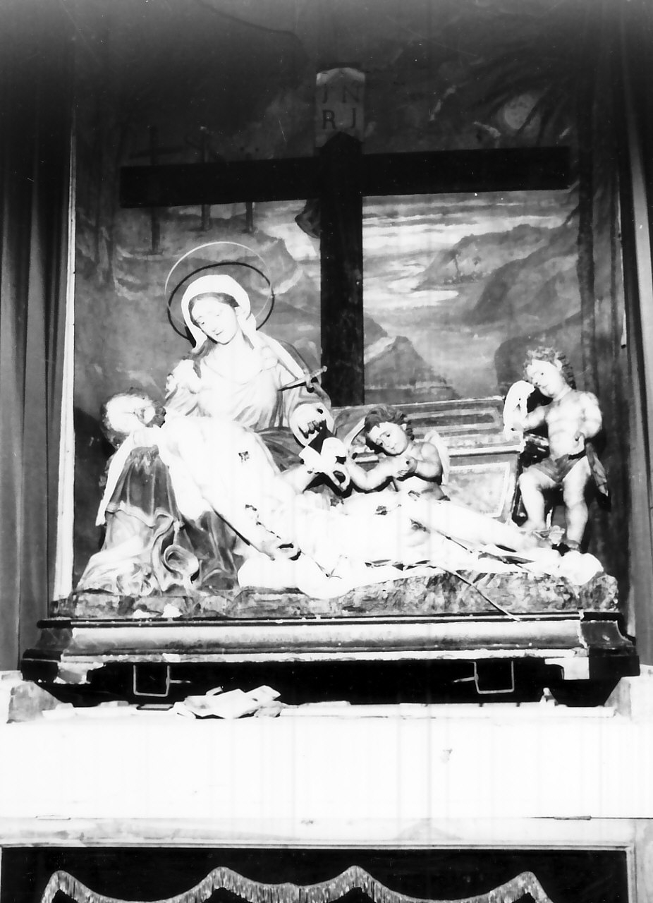 Personaggi: Cristo morto; Madonna Addolorata. Attributi: (Madonna Addolorata) spada trafitta nel cuore. Figure: angeli