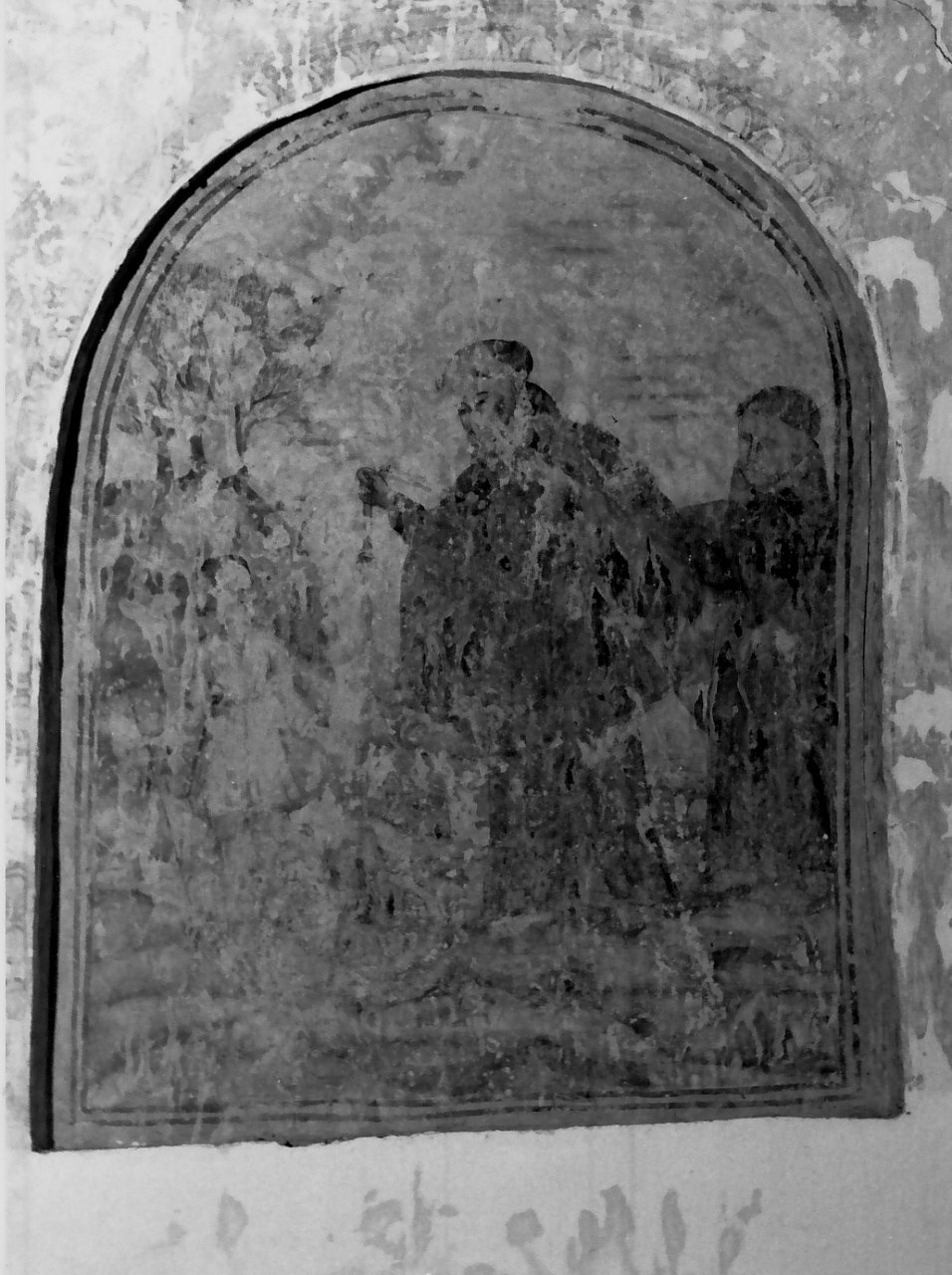 Dipinto murale raffigurante una scena della vita di San Francesco d'Assisiinsieme con un frate francescano e un bambino