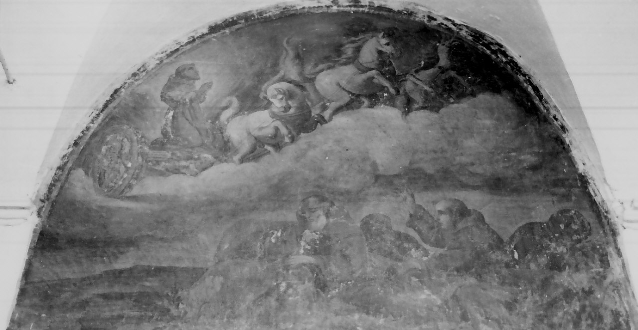 San Francesco su carro trainato da cavalli in cielo e frati distesi in terra