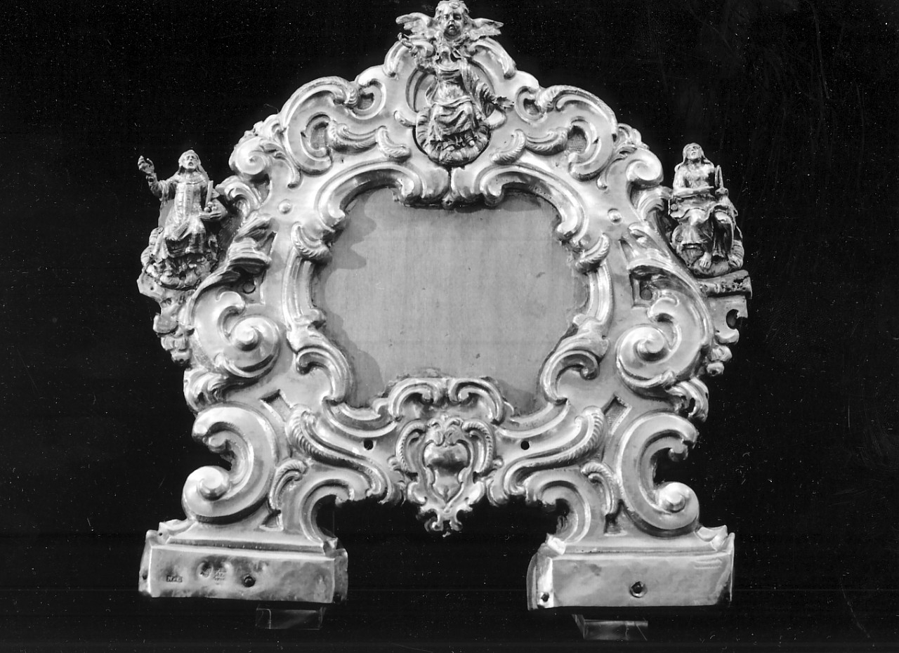 cartagloria di piccole dimensioni poggiante su due piedini a pianta rettangolare sui quali si adagiano corpose volute angolari; cornice sagomata riccamente ornata da volute a ricciolo affrontate e addossate; ai lati sono applicate due microsculture a tutto tondo: a sinistra San Nicola da Bari e a destra San Giovanni Battista, mentre in alto al centro vi la figura della Madonna assunta