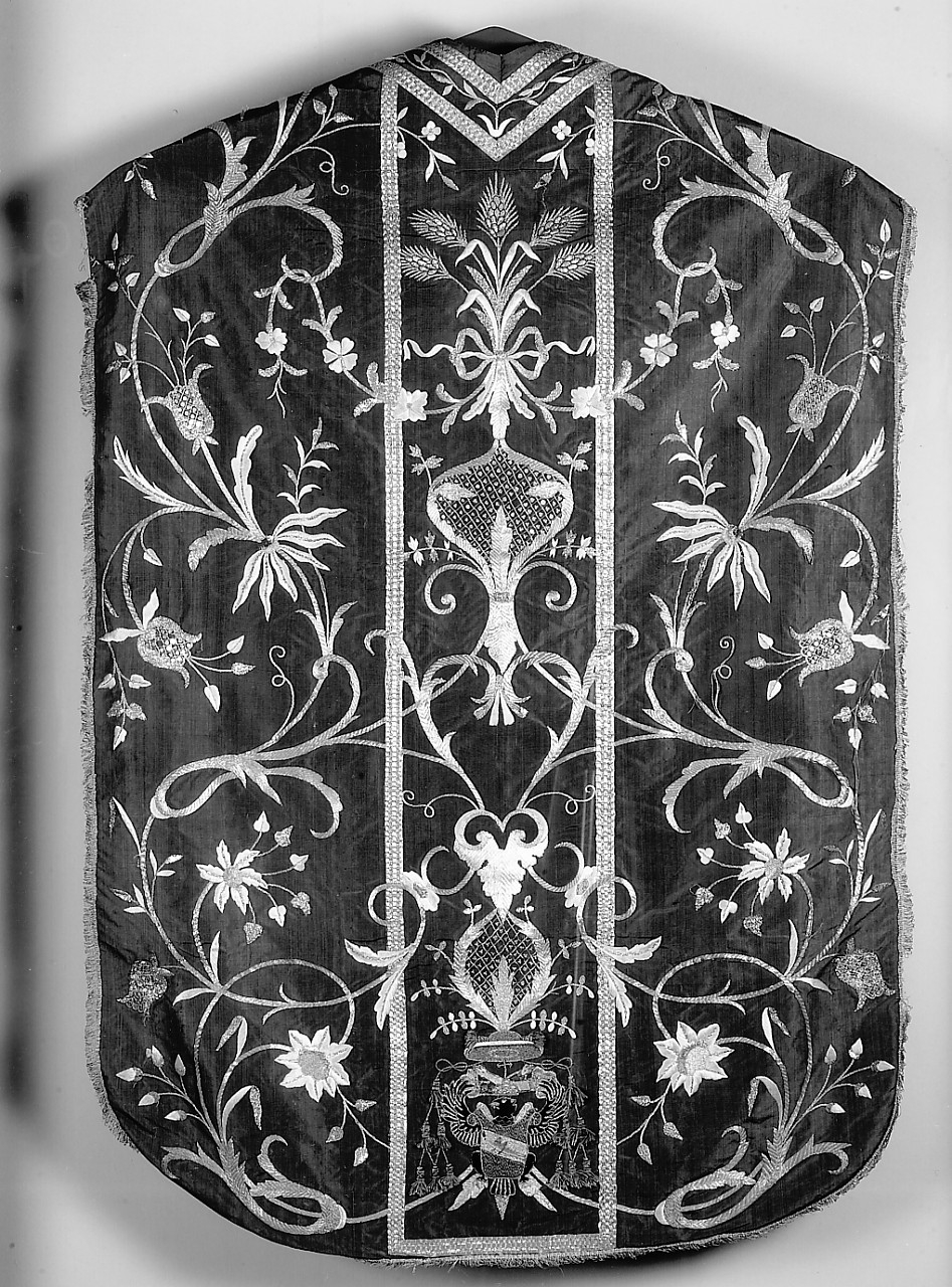 Pianeta in seta di colore azzurro con ricami in argento e stemma vescovile ricamato