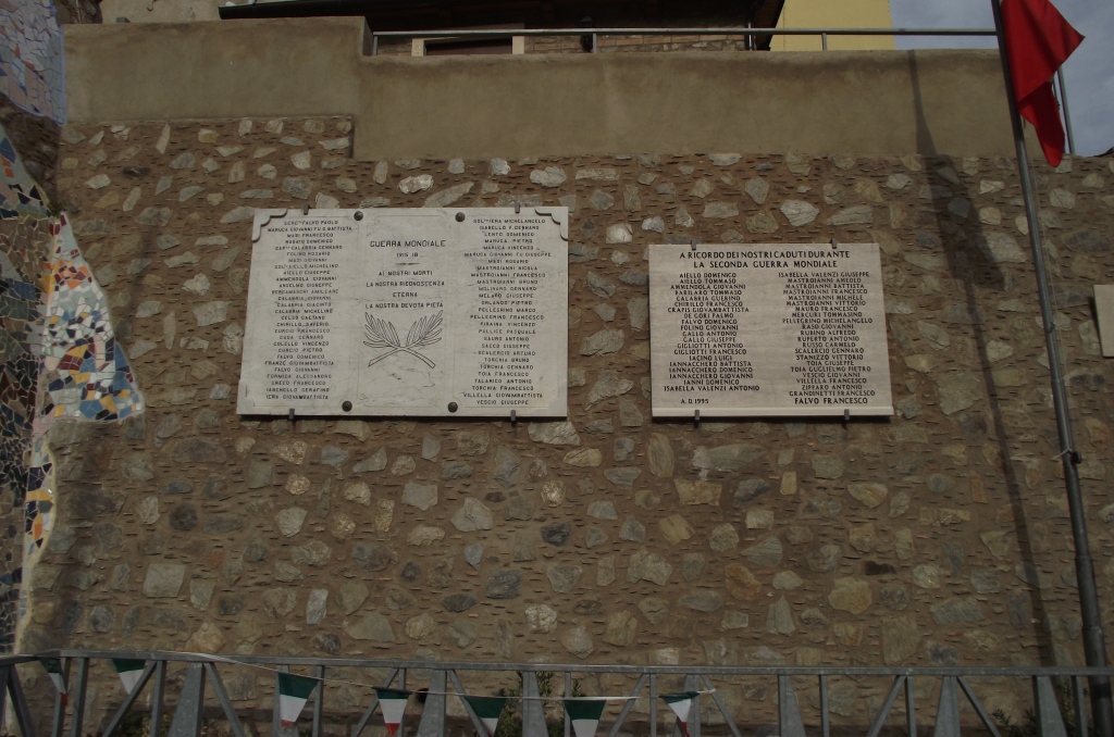 La lapide in marmo è divisa verticalmente in tre settori mediante riquadri realizzati ad incisione. Quello centrale con borchie in bronzo agli angoli, dedica e palme incrociate incise, e quelli laterali con i nominativi dei caduti. Essa è collocata sul muro di contenimento lato est della piazza, accanto ad essa, a destra, è stata collocata un'altra lapide con i nominativi dei caduti della II guerra mondiale