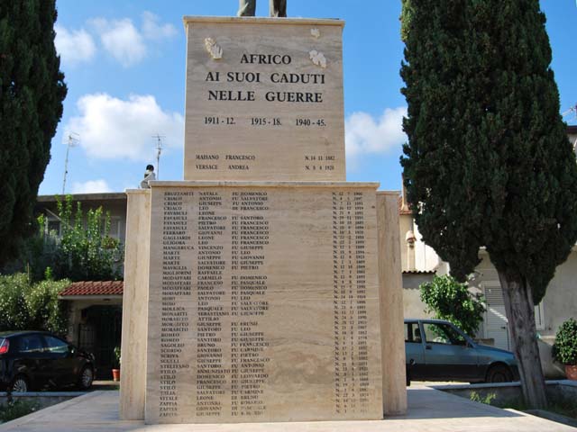 - ISCRIZIONI basamento, prospetto frontale, in alto - AFRICO / AI SUOI CADUTI / NELLE GUERRE / 1911-1912. 1915-1918. 1940-45. / - maiuscolo -