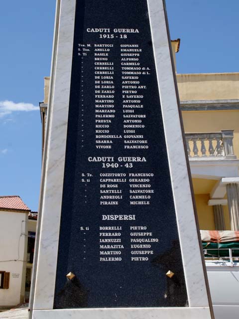 - ISCRIZIONI obelisco, prospetto laterale sinistro - CADUTI GUERRA / 1915 -18 / Ten. M. BARTUCCI GIOVANNI / S. Ten. ANELLO EMANUELE / S. Ti BASILE GIUSEPPE / '' BRUNO ALFONSO / '' CERBELLI CARMELO / '' CERBELLI TOMMASO DI A. / CERBELLI TOMMASO DI L. / DE LORIA SAVERIO / DE LORIA ANTONIO / DE ZARLO PIETRO ANT. / DE ZARLO PIETRO / FERRARO F. SAVERIO / MARTINO ANTONIO / MARTINO PASQUALE / MARZANO LUIGI / PALERMO SALVATORE / PRESTA SALVATORE / RICCIO DOMENICO / RICCIO LUIGI / RONDINELLA GIOVANNI / SBARRE SALBATORE / VIVONE FRANCESCO - maiuscolo -