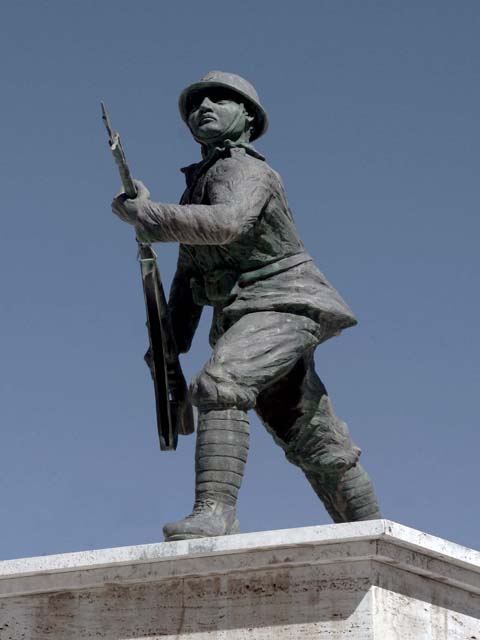 base a tronco a di piramide e figura di soldato in combattimento, con il fucile puntato verso il nemico; sul prospetto frontale vi è un'iscrizione dedicatoria ed una corona di alloro
