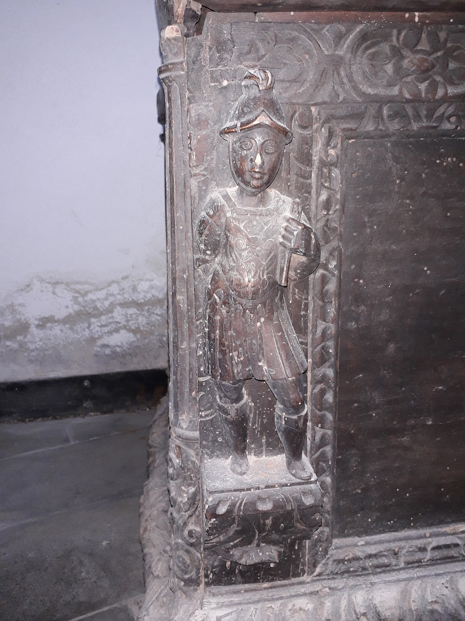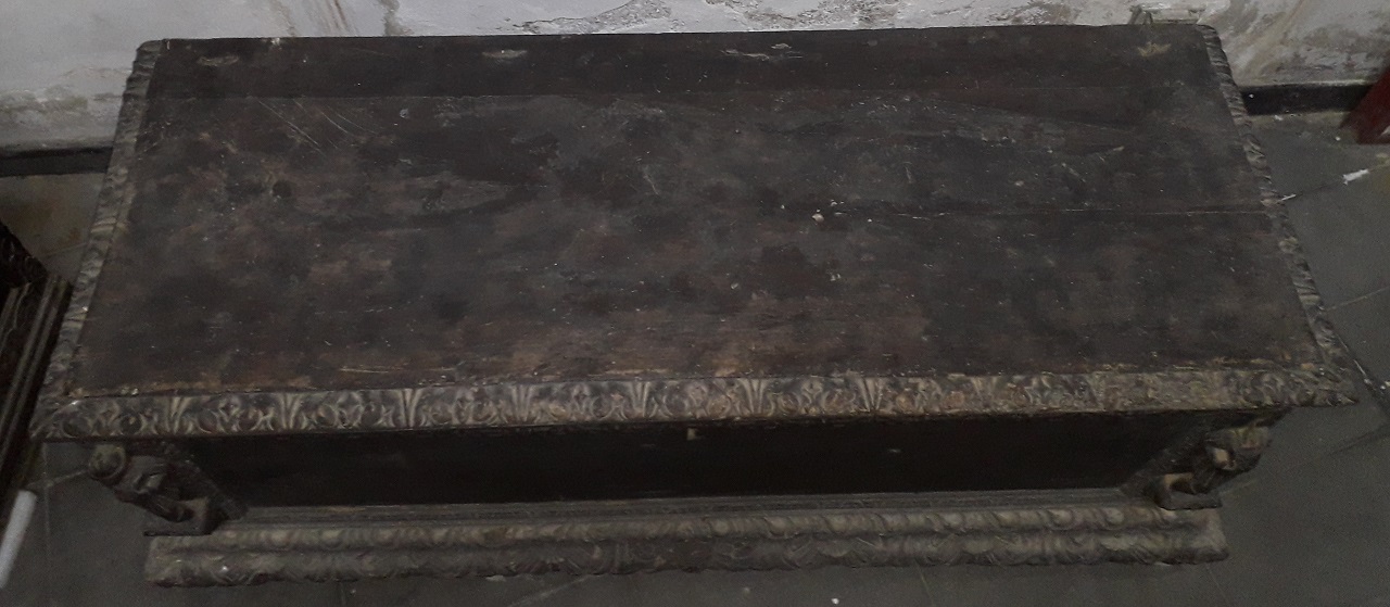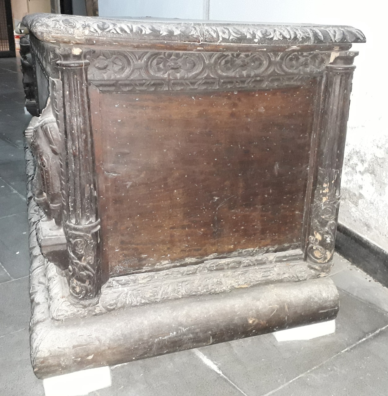Cassa quadrangolare in noce, presenta il bordo del piano intagliato a foglie stilizzate ricorrenti. Il frontale è racchiuso da una fascia sottopiano a intagli geometrico-floreali, mentre ai lati le lesene presentano una figura ad alto rilievo raffigurante un soldato, o figura allegorica, in lorica classica e stivali, che regge, forse, un arma da taglio con la destra, stante su piccola mensola aggettante. Le lesene dei laterali sono composte da semicolonne con imoscapo decorato a girali e fusto superiore scanalato. Il basamento della cassa è composto da doppio ordine di cornici convesse sovrapposte, la prima più stretta a baccellature divergenti contrapposte, e quella inferiore più ampia intagliata a motivi geometico-floreali con al centro un elemento aggettante, mutilo della parte superiore, forse una protome zoomorfa o antropomorfa, con ai lati ali spiegate. Dagli inventari risulta l'esistenza di piedi leonini oggi non più presenti