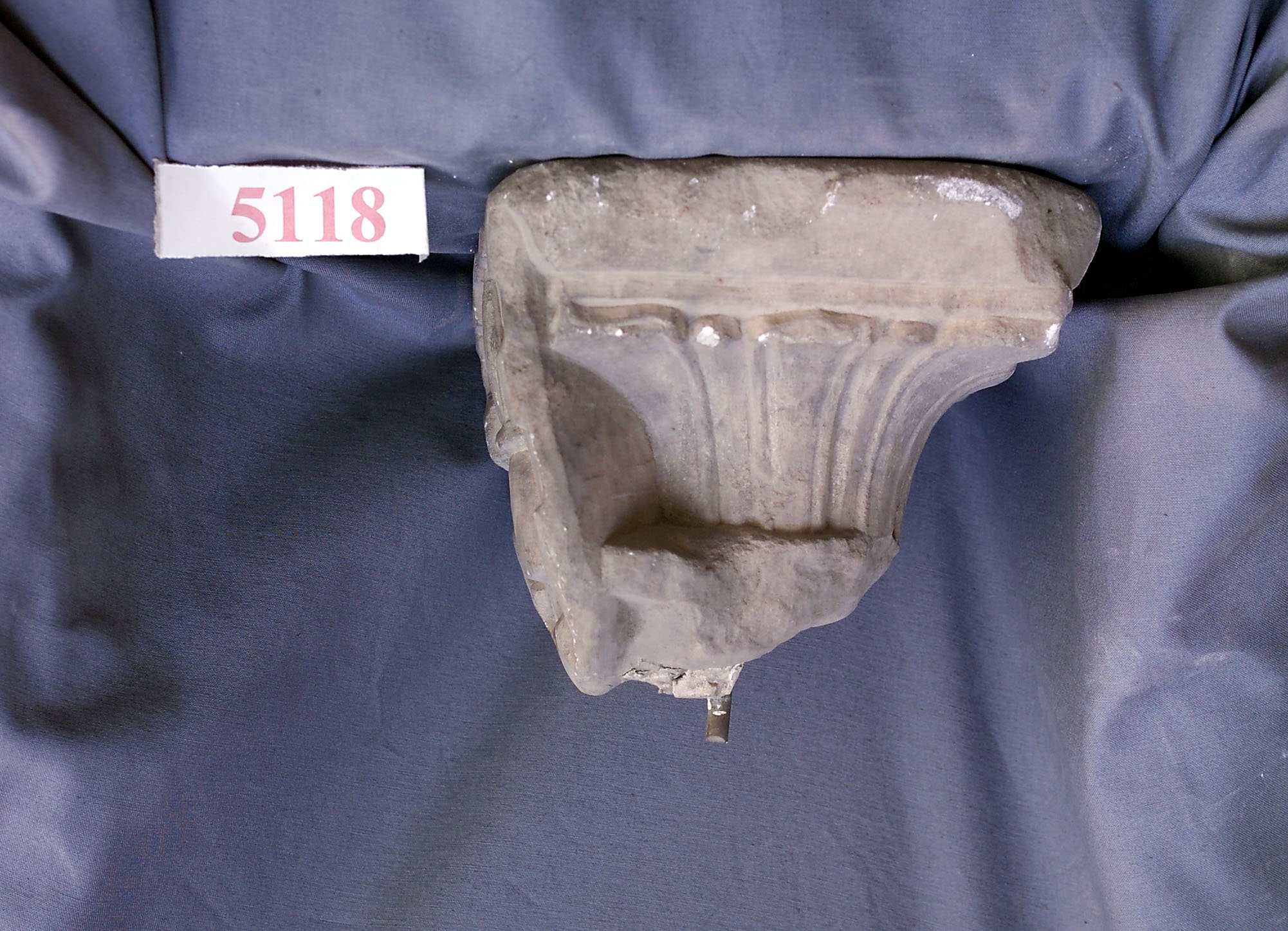 Capitello con foglie stilizzate; su una faccia uno scudo con bordo decorato e giglio. Le piccole dimensioni del capitello ne suggeriscono l'uso a sostegno di colonnine in finestre bifore o trifore, come attestato negli edifici dell'epoca