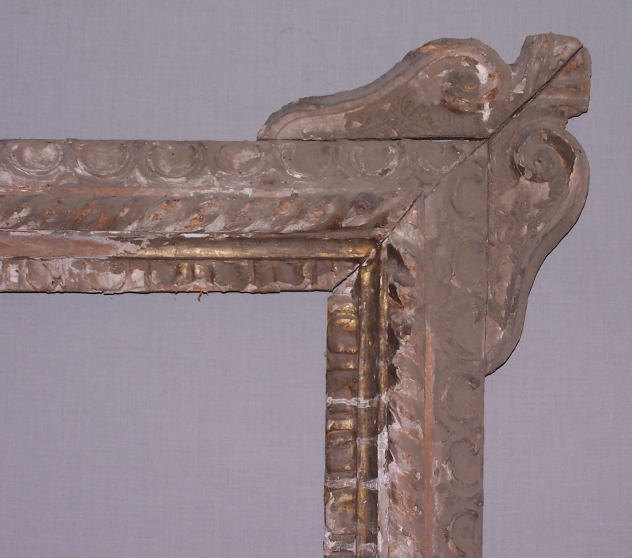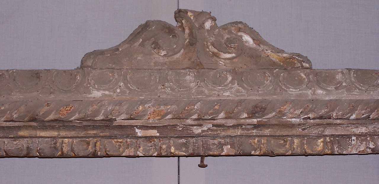 Cornice rettangolare intagliata e dorata presenta la battuta a larga baccellatura stilizzata e controbattuta a gola semplice delimitata da zone di riposo piatte. Parte centrale fortemente aggettante intagliata a tortiglione. Controprofilo a gola semplice intagliata ad ampi baccelli circolari e profilo piatto a muro. Ai quattro angoli e al centro del lato superiore, acroteri a volute contrapposte con sorta di pigna centrale e decorazione interna fito-floreale incisa