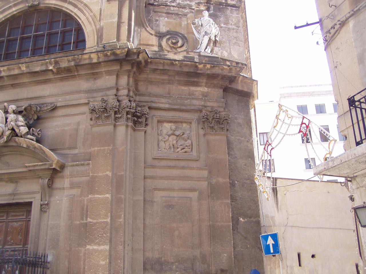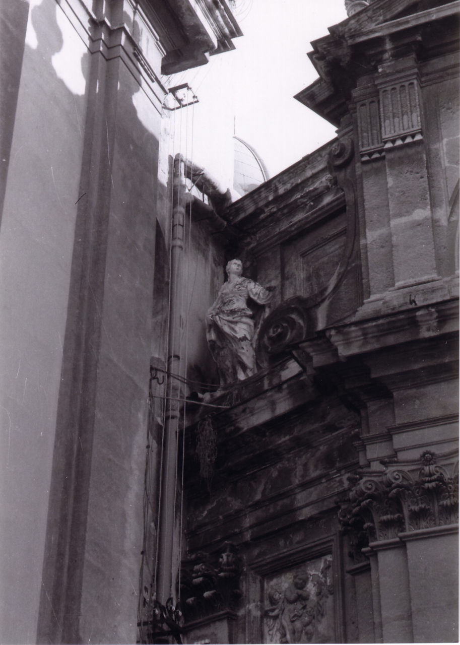 Le due statue sul frontone in alto, contengono il barocchismo di impianto in una strutturazione che si direbbe architettonica, facendo le sculture corpo con la facciata stessa, con evidente intento di essere colte dal basso. Mancando gli attributi iconografici è incerta l‘identificazione dei due Santi in alto a destra ed a sinistra della facciata