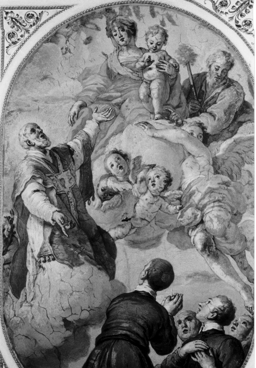 Apparizione della Madonna a San Filippo Neri. Madonna col bambino in cielo e San Giuseppe, San Filippo Neri in Gloria e Padri Filippini