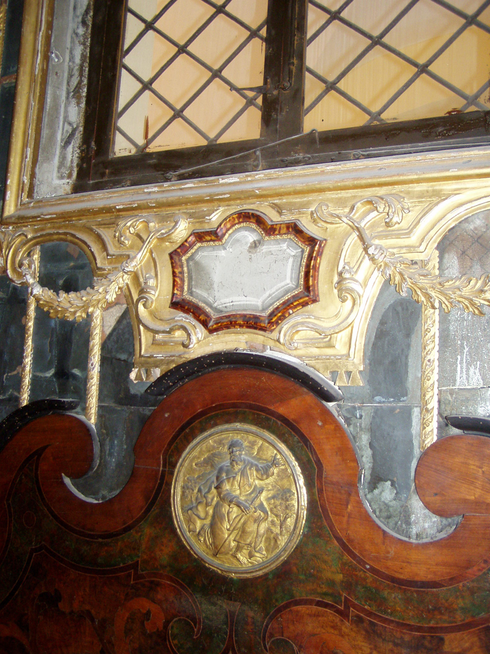 Le cornici in tartaruga mistilinee in numero di due, al centro delle pareti lunghe e sotto le finestre della stanza rettangolare, impreziosiscono l‘apparato decorativo con il caldo colore della tartaruga inquadrate da motivi a volute ed animate da forme fitomorfe e stilizzate in legno dorato. Morfologicamente erano destinate ad inquadrare probabili reliquiari