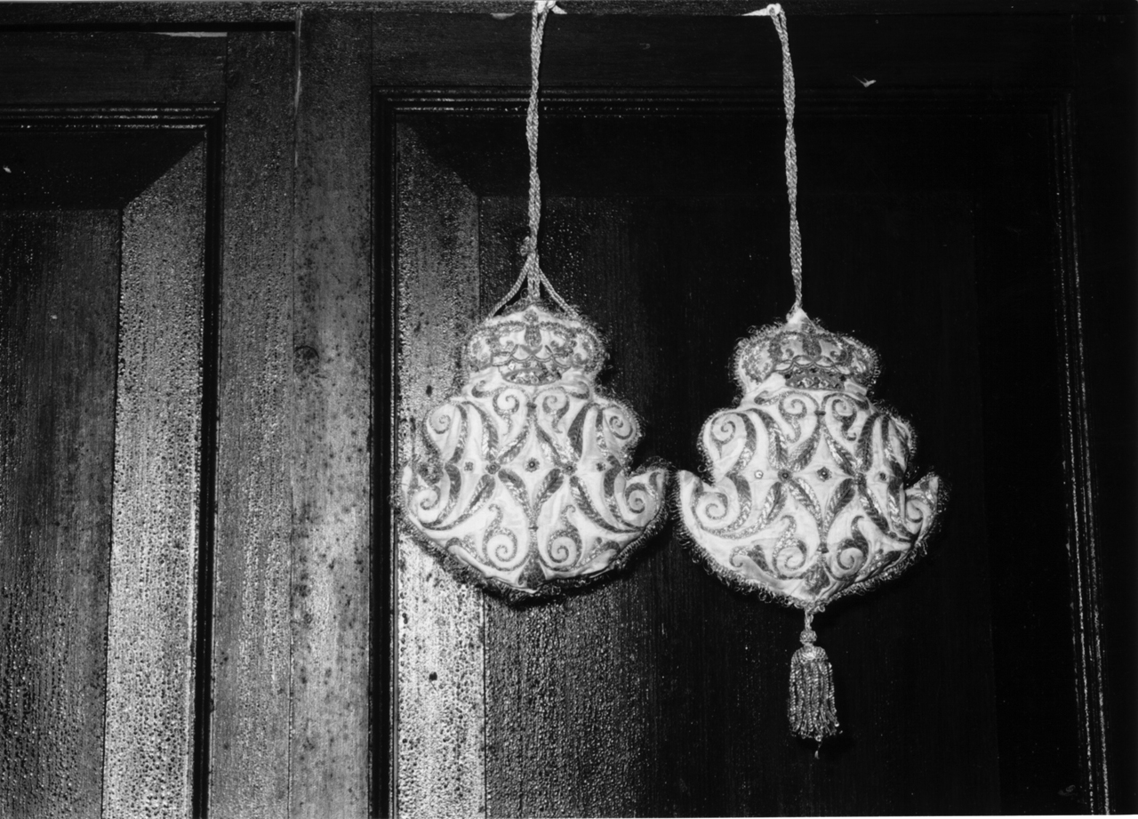 I fiocchi presentano una sagoma articolata, tracciata sul tessuto contornati da un galloncino a frangia. Nella parte superiore una corona, ornata di paste vitree, sovrasta un decoro a volute che ad una attenta analisi si rivela essere il monogramma mariano AVM. In basso uno dei fiocchi presenta una terminazione a nappa in filo d‘oro
