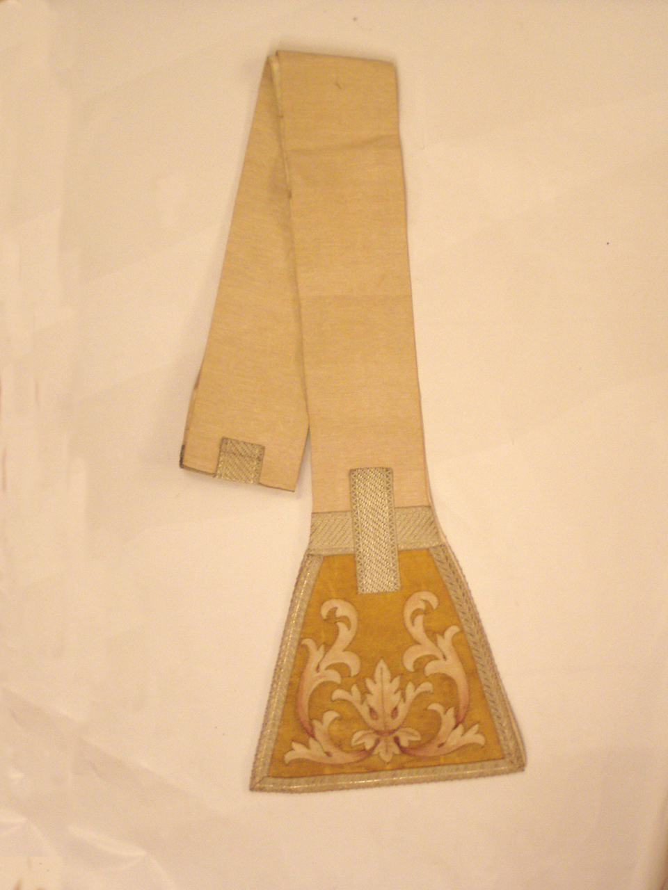La stola presenta dipinti a chiaro scuro, su un fondo di gros giallo laminato in oro, girali d‘acanto fiorito di ispirazione classica. La pittura eseguita su gros di seta crema è contornata nella linea di congiunzione con il tessuto laminato da un cordonetto in filato d‘oro. Il decoro è nella sola parte svasata, l‘unica realizzata con la preziosità della pianeta a cui si associa, essendo la parte superiore realizzata con gros color crema senza ornati. La tecnica di realizzazione è davvero particolare poiché ciò che costituisce "il fondo" su cui si stagliano i decori è in realtà intagliato e gli ornati dipinti vi sono apposti dal retro. Tre croci in gallone d‘argento (due delle quali collocate in corrispondenza della giuntura tra le parti ornate e quelle non decorate) con motivo "a nido d‘ape" completano il manufatto. Un gallone in filato d‘argento tessuto a telaio contorna la parte inferiore
