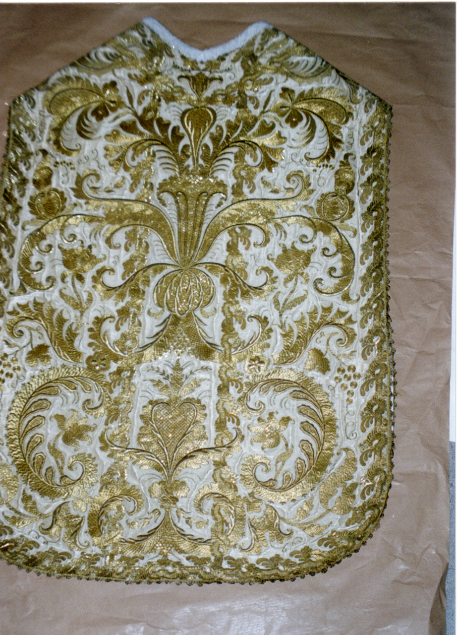 La pianeta, pur con la tipica tripartizione verticale, presenta un disegno che invade l‘intero campo utilizzando un complesso svilupparsi di grandi motivi fitomorfi (foglie acantine, vitigni etc.), fiorami e grappoli vitinei. Punto nodale, nella parte alta, un grande fiore a calice posto in centro e sovrastante motivo cuoriforme. Ovunque viticci, foglioline e girali riempiono ogni spazio visivo libero. Un articolato sistema decorativo a foglie orientate costituisce un gallone perimetrale ricamato di ridondante ricchezza